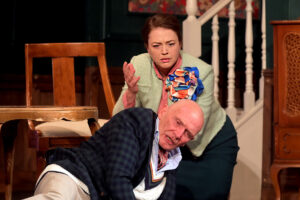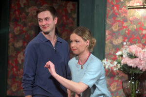 Trzeci dzień 29 Jesiennego Festiwalu Teatralnego to „Pocztówki z Europy” – komedia, ale czy na pewno. Niby ludzie się śmieją, są dowcipy, zwroty akcji, ale wszystko w tej sztuce jest inaczej. Dom się przechyla, meble stoją krzywo, obrazy nie wiszą jak trzeba, babcia nie żyje, ale jednak nie, pies zdechł, a jest…