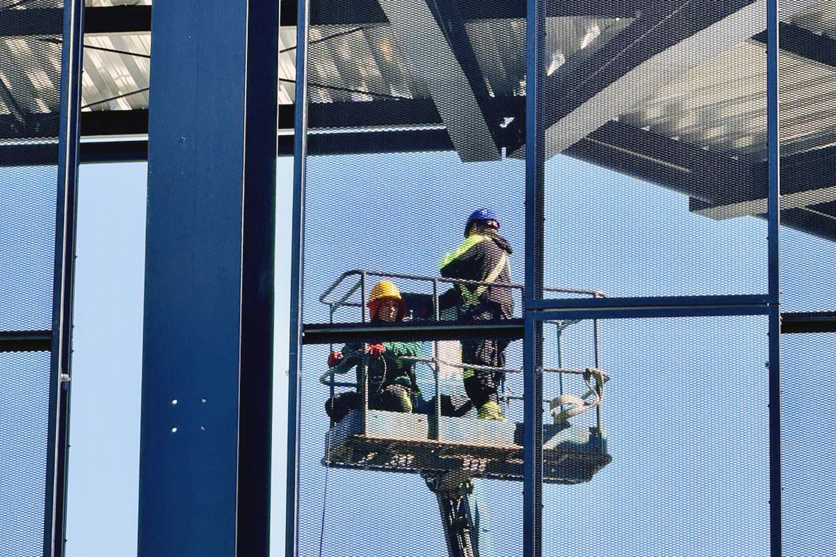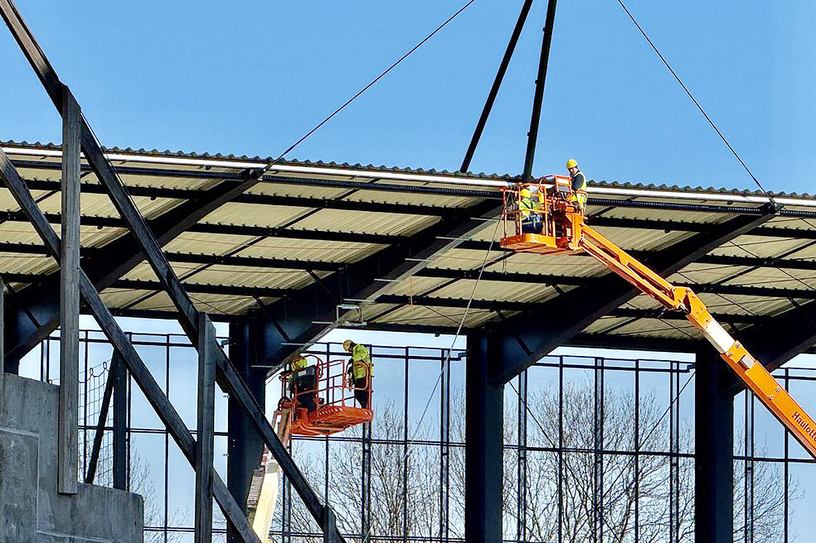 Prezes spółki NIK Dawid Janik wyjaśnia, że po zakończeniu ważnych prac związanych z ułożeniem zadaszenia trybun, ekipa elektryczna prowadzi prace instalacyjne przy oświetleniu trybuny B.